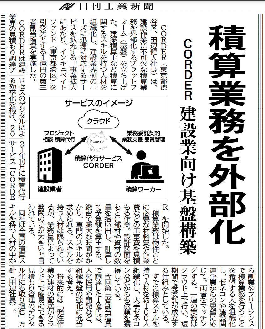全国の記者が直接取材した「コアでニッチなビジネス情報」を届ける『日刊工業新聞』の2022年9月2日付 紙面および電子版に、弊社の「積算代行サービス」が掲載されました。